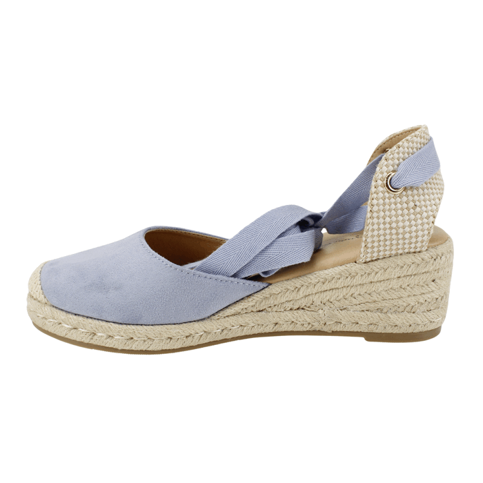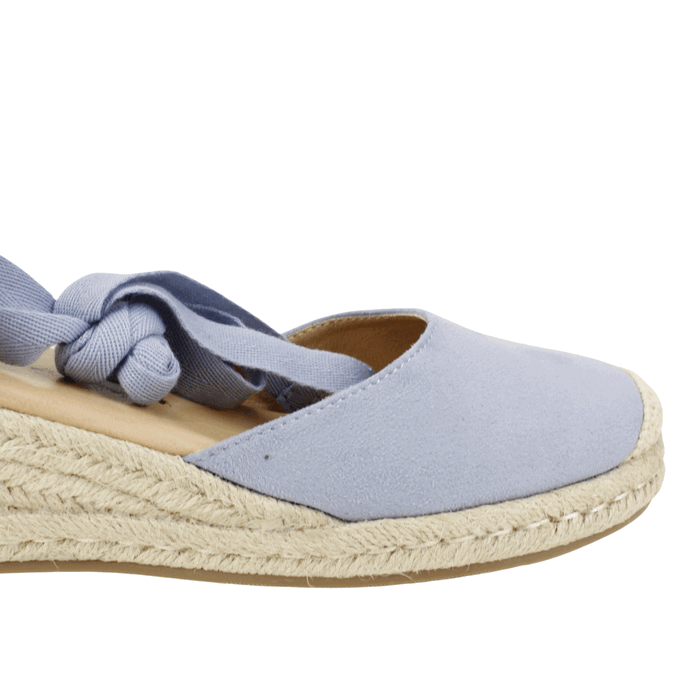 Alpargata de Mujer Agua de Coco color celeste. Estilo Casual. Presentamos nuestra Alpargata de Cuña con Lazos, el complemento perfecto para elevar cualquier atuendo de primavera-verano. Este diseño combina la comodidad de una cuña media de yute trenzado natural con la sofisticación de las cintas de amarre. El color celeste del cuerpo y los lazos ofrece un contraste chic con la suela de esparto, haciéndolas increíblemente versátiles. Ajuste mediante lazos. Plataforma de 5,5 cm.