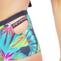 Bikini fabricado en Colombia. Top tipo sostén con barba. Ajunte en espalda y breteles ajustables. Posee copa soft para moldear el busto. Diseño setentero con estampado hawaino aplicación de mostacillas. Calzón normal con apertura en caderas y corte alzador de gluteos.