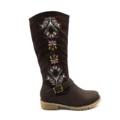 Bota Verazzi color Marrón. Estilo Casual. Capella símil cuero en la planta y símil gamuza en la caña con bordados multiculor. Correa decorativa con hebilla que cruza el tobillo. Plantilla acolchada para mejorar la comodidad. Planta de taco cuadrado de 2,5 cm de altura. Ajuste mediante cierre lateral. Suela de Goma. Altura de caña 28 cm.Capellada: Simil Cuero.Forro: Textil.