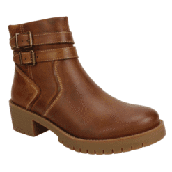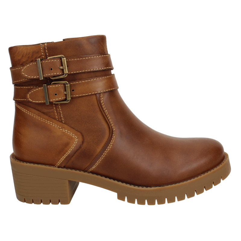 Botín de Mujer Palm de cuero color marrón. Estilo Casual. Añade un toque robusto y lleno de estilo a tus looks con estos botines de piel para mujer. Fabricados en cuero de alta calidad con un acabado pulido y encerado, estos botines destacan por su diseño urbano. Presentan dos correas ajustables con doble hebilla metálica en acabado latón antiguo que envuelven el tobillo, aportando carácter y un ajuste personalizado. Cuentan con una práctica cremallera lateral interior para ponerlos y quitarlos fácilmente. La contundente suela de goma estilo track con un tacón bloque medio ofrece una excelente tracción, durabilidad y una pisada firme y cómoda. La puntera redondeada y las costuras en contraste completan su diseño funcional. Son ideales para combinar con jeans, faldas de cuero o vestidos fluidos para un contraste impactante este otoño-invierno. El forro interior textil proporciona calidez y confort. Ajuste mediante cierre interno. Taco Cuadrado de 5 cm de alto y caña de 12,5 cm.