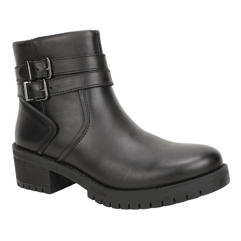 Botín de Mujer Palm de cuero color marrón. Estilo Casual. Añade un toque robusto y lleno de estilo a tus looks con estos botines de piel para mujer. Fabricados en cuero de alta calidad con un acabado pulido y encerado, estos botines destacan por su diseño urbano. Presentan dos correas ajustables con doble hebilla metálica en acabado latón antiguo que envuelven el tobillo, aportando carácter y un ajuste personalizado. Cuentan con una práctica cremallera lateral interior para ponerlos y quitarlos fácilmente. La contundente suela de goma estilo track con un tacón bloque medio ofrece una excelente tracción, durabilidad y una pisada firme y cómoda. La puntera redondeada y las costuras en contraste completan su diseño funcional. Son ideales para combinar con jeans, faldas de cuero o vestidos fluidos para un contraste impactante este otoño-invierno. El forro interior textil proporciona calidez y confort. Ajuste mediante cierre interno. Taco Cuadrado de 5 cm de alto y caña de 12,5 cm.