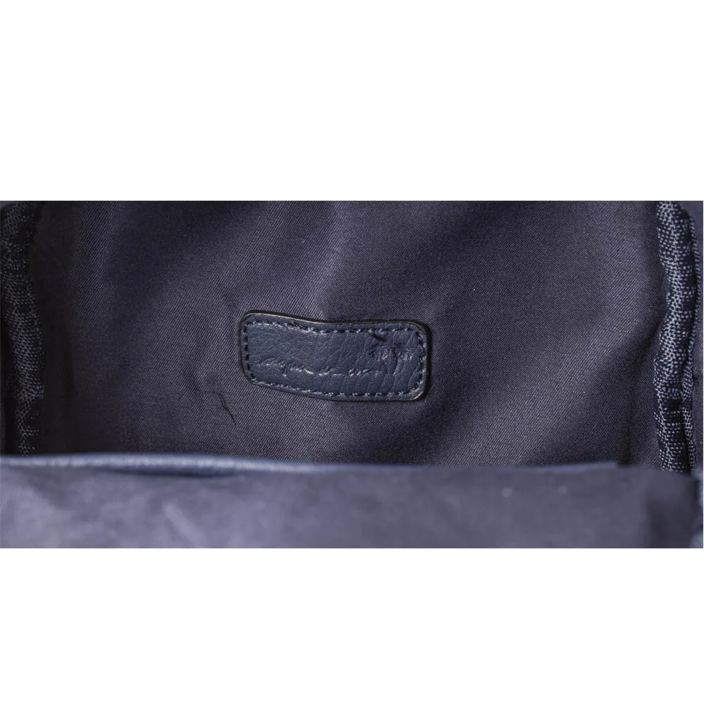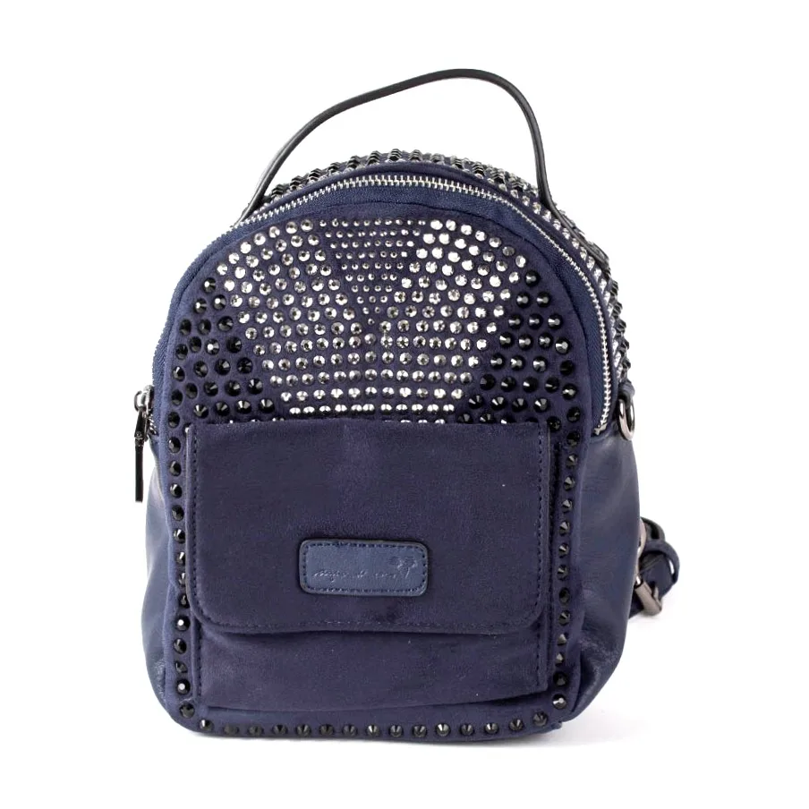 Mochila Azul Tachas Agua de Coco. Confección simíl cuero. Interior forrado. Bolsillo frontal. Bolsillos organizadores. Correas desmontables. Ajuste mediante cierre. Medidas: Profundidad 9 cm Ancho 17 cm Alto 20 cm Largo Correa 160 cm