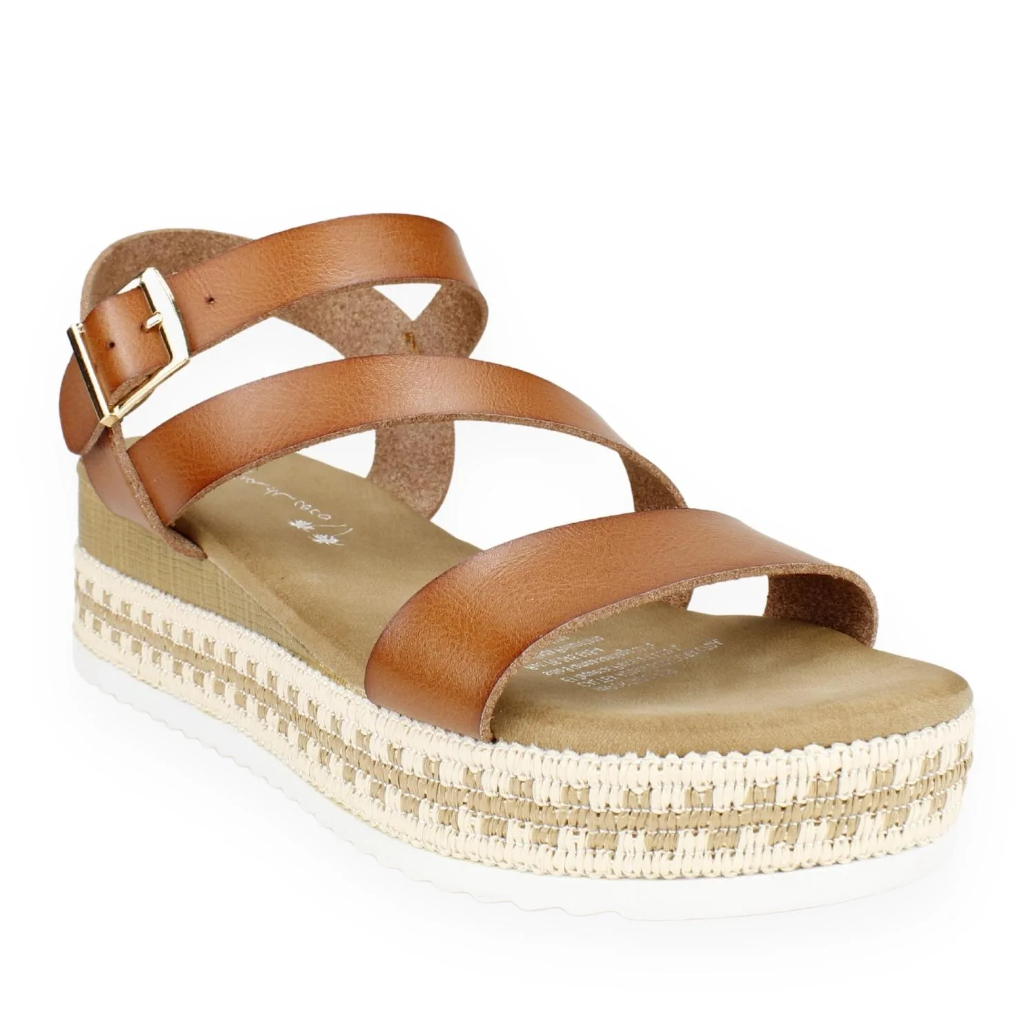 Sandalia Mujer Agua de Coco color Camel. Estilo casual. Material Capellada: Poliuretano. Material Forro: Poliuretano. Material Plantilla: Poliuretano. Diseño de correas lisas que cruzan empeine con planta decorada textil. Tipo de Cierre: Hebilla lateral. Altura planta: 5,5 cm. Tabla de medidas: 35 mide 23 cm; 36 mide 24 cm; 37 mide 25 cm; 38 mide 26 cm; 39 mide 26,5 cm; 40 mide 27 cm.