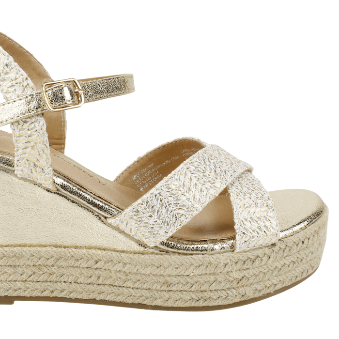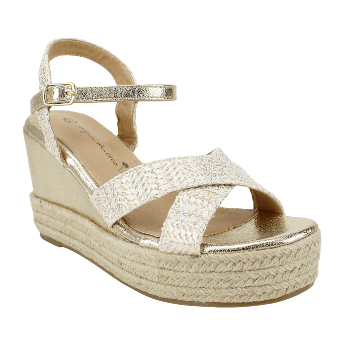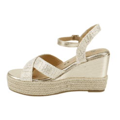 Sandalía de Mujer Agua de Coco color dorado. Estilo Casual. Presentamos nuestra deslumbrante Sandalia de Plataforma y Cuña en color Dorado Metálico, el calzado perfecto para añadir un toque glam a tus atuendos de fiesta, bodas o cualquier evento de verano. Este modelo combina una audaz altura con un diseño cómodo y seguro. Ajuste mediante correa al tobillo Plataforma trasera de 9 cm y delantera de 3,5 cm de alto.