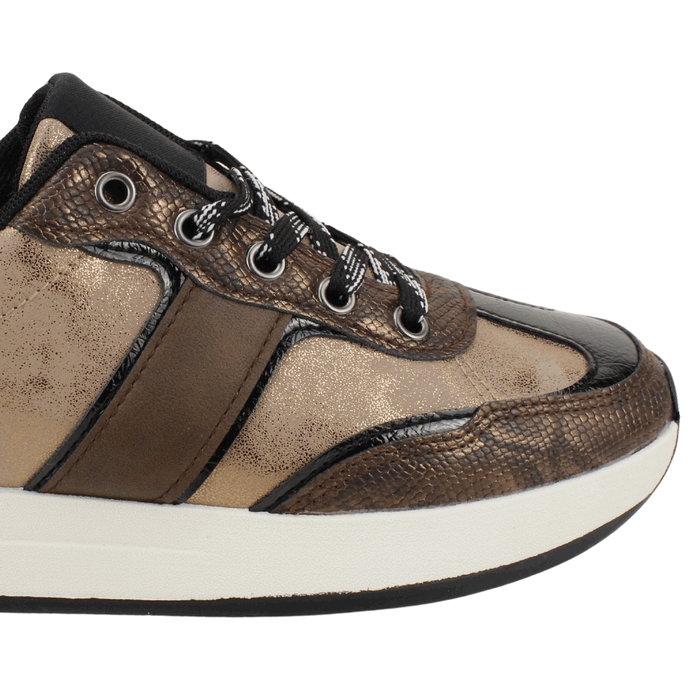 Zapatilla Mujer Agua de Coco color café. Estilo Urbano. Combina confort y estilo con estas zapatillas de plataforma versátiles. Su diseño multicolor y con múltiples texturas las hace el punto focal de cualquier atuendo, desde jeans hasta vestidos casuales. La suela ancha y la plantilla acolchada están diseñadas para ofrecer una pisada estable y cómoda, ideal para tus caminatas diarias o para un día ajetreado. Con su sistema de cordones, podrás ajustarlas a tu medida y disfrutar de una sensación de seguridad en cada paso. Ajuste mediante cordones. Plataforma de 3 cm de altura y caña de 5,5 cm de alto.