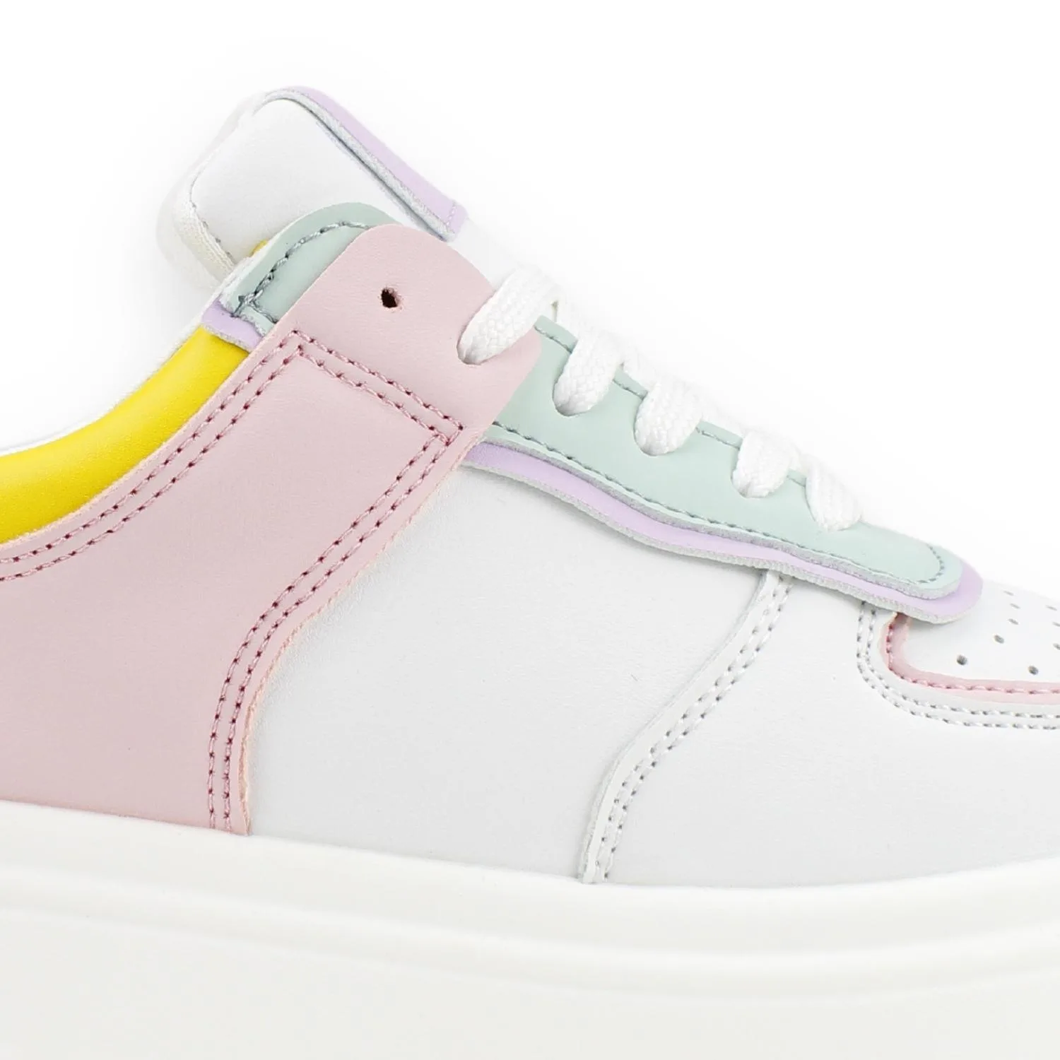 Zapatilla Mujer Agua de Coco color Blanca. Estilo urbano. Material Capellada: Poliuretano. Material Forro: Textil. Material Planta: Goma. Diseño multicolor en tonos pasteles. Tipo de Cierre: Cordones. Forma de planta: Plataforma. Altura exacta de planta: 5 cm. Altura caña: 7 cm.