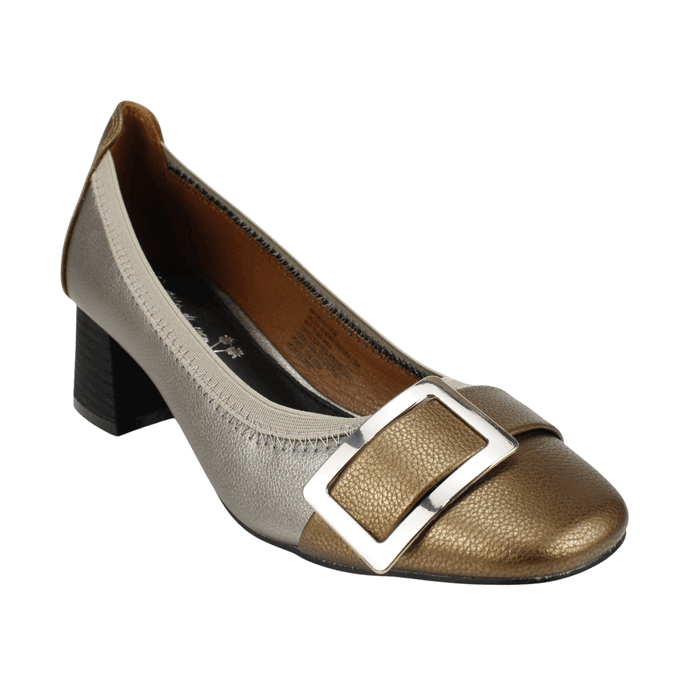 Zapato de Mujer Agua de Coco color plateado. Estilo Casual. Descubre la perfección para tu jornada laboral o eventos largos con nuestros Zapatos de Salón Bicolor. Este diseño combina el confort de un calzado de día con la tendencia metalizada que domina la moda. El cuerpo principal es de un tono plata claro/champán texturizado, contrastando elegantemente con la punta y el talón en dorado/bronce envejecido. Ajuste tipo Slip On. Taco cuadrado de 5 cm de alto y caña de 6 cm de altura.