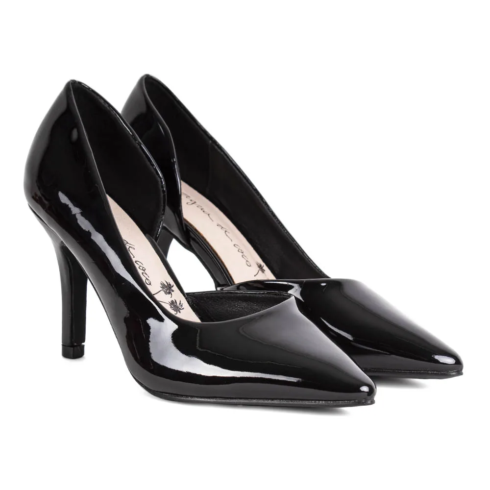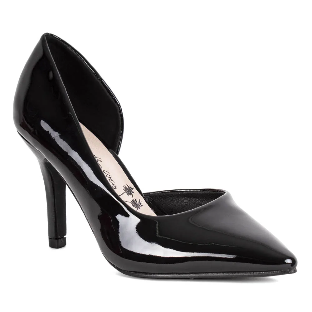 Zapato estilo formal negro acharolado de taco alto. Capellada símil charol. Altura taco de 9 cms y caña de 6 cms. Materialidad Capellada: Sintético, Forro: Sintético y Planta Sintética.